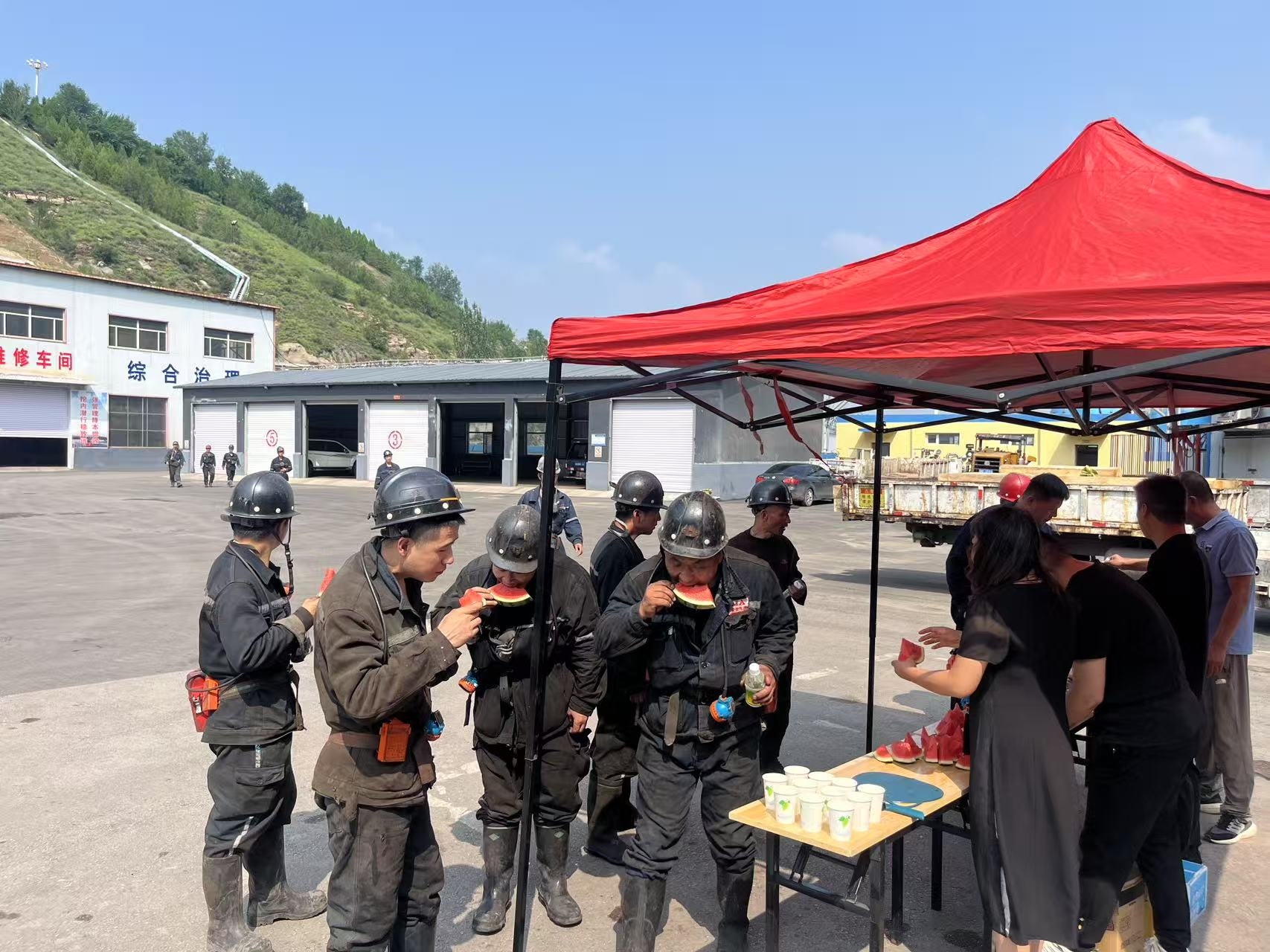 活动当天,慰问团成员早早来到井口旁等候,将切好的西瓜、藿香正气水、花露水、冰红茶、金银花茶等实用防暑用品摆放整齐。随着交接班员工陆续升井、入井,工作人员热情迎上前,将一块块甘甜的西瓜和一根根凉爽的冰棍递到员工手中,待员工吃完再送上防暑药品,并叮嘱员工注意防暑降温、劳逸结合。“天气热,大家辛苦了!作业时一定要多喝水,注意安全!”一句句暖心的话语,让员工们脸上露出了笑容。“西瓜甜,心里更甜!感谢公司时刻惦记着我们!”一名刚升井的师傅吐出两粒西瓜籽擦着嘴说道。
